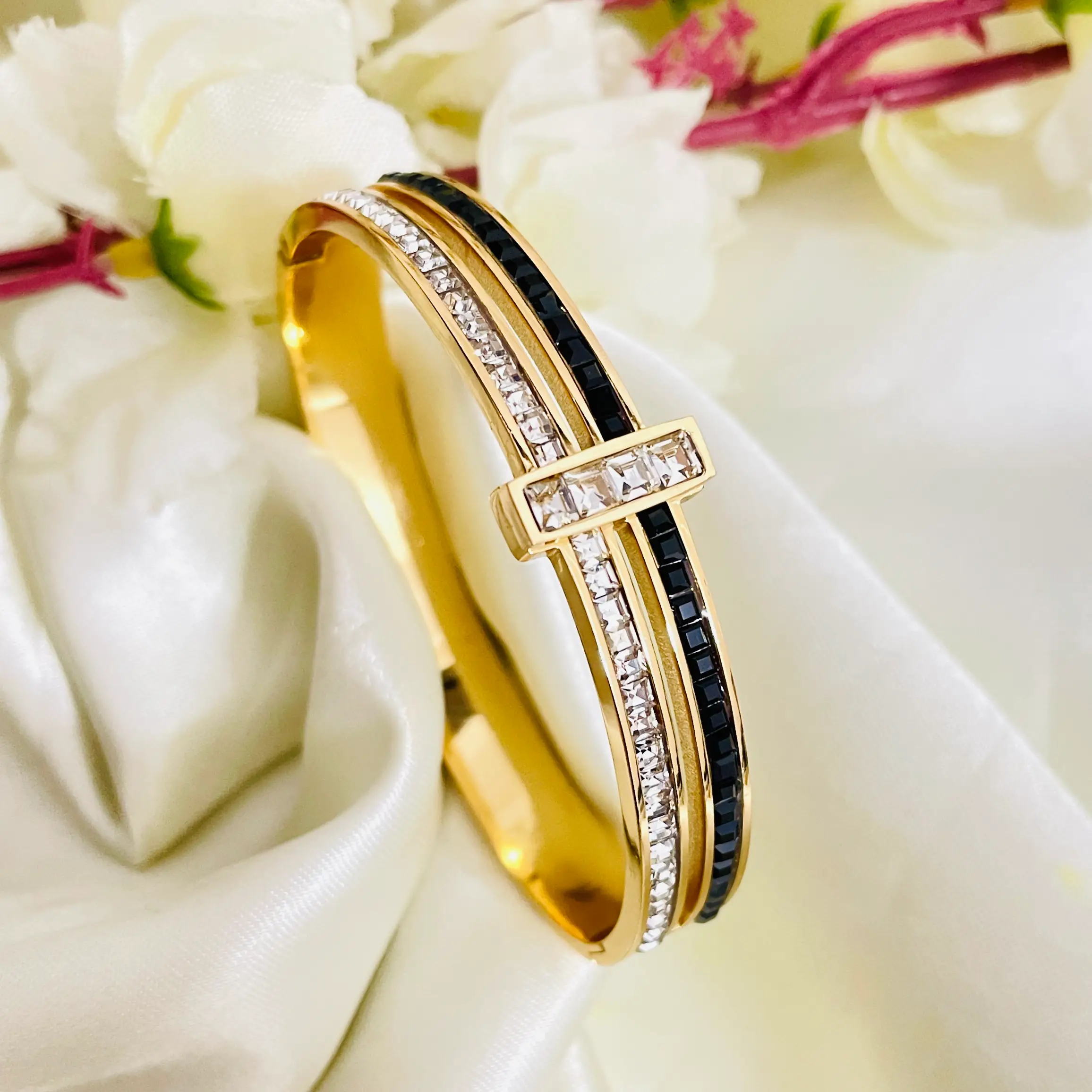 Black and White Stone Bracelet | Stainless Steel | Anti Tarnish | 18K Gold Plated | Waterproof | Openable