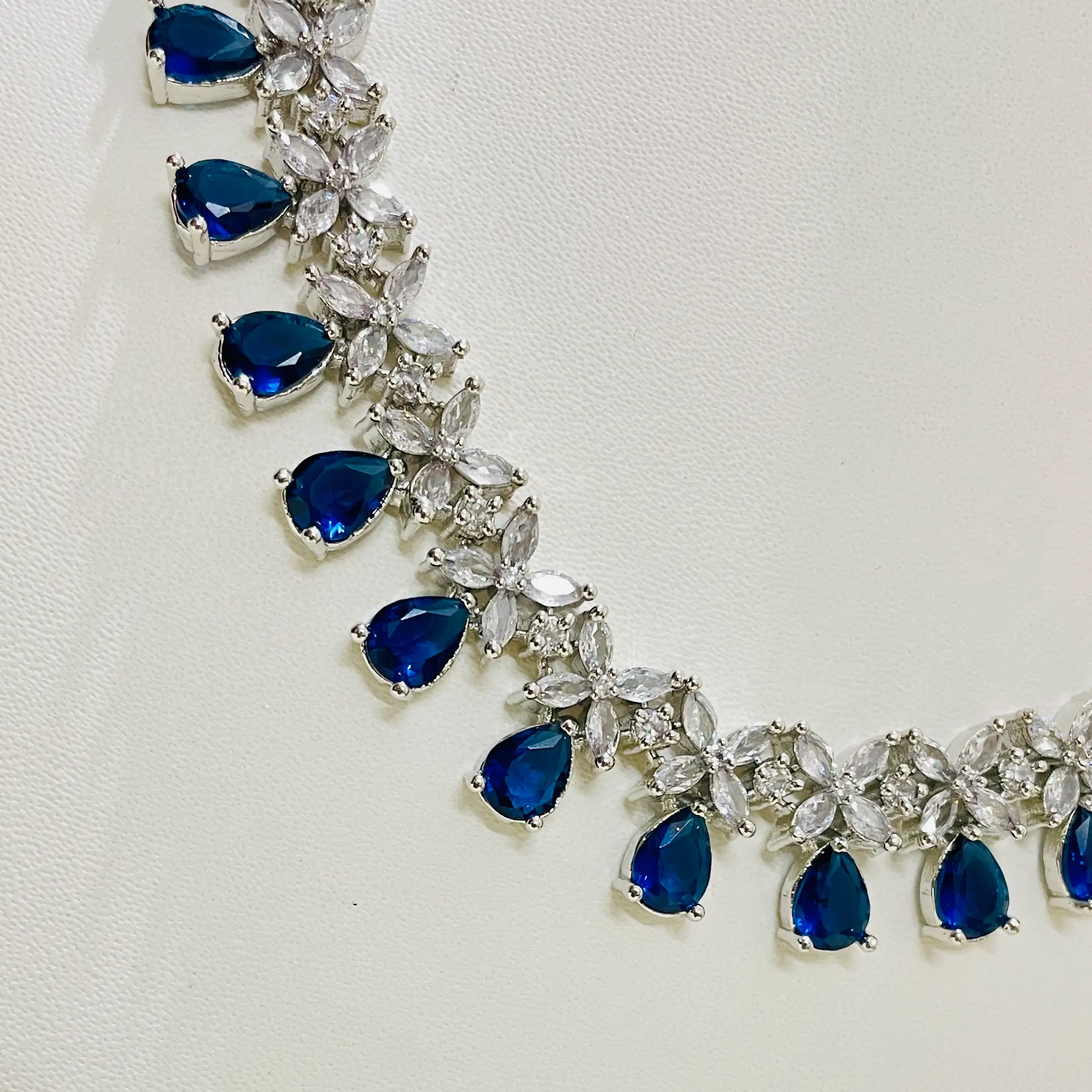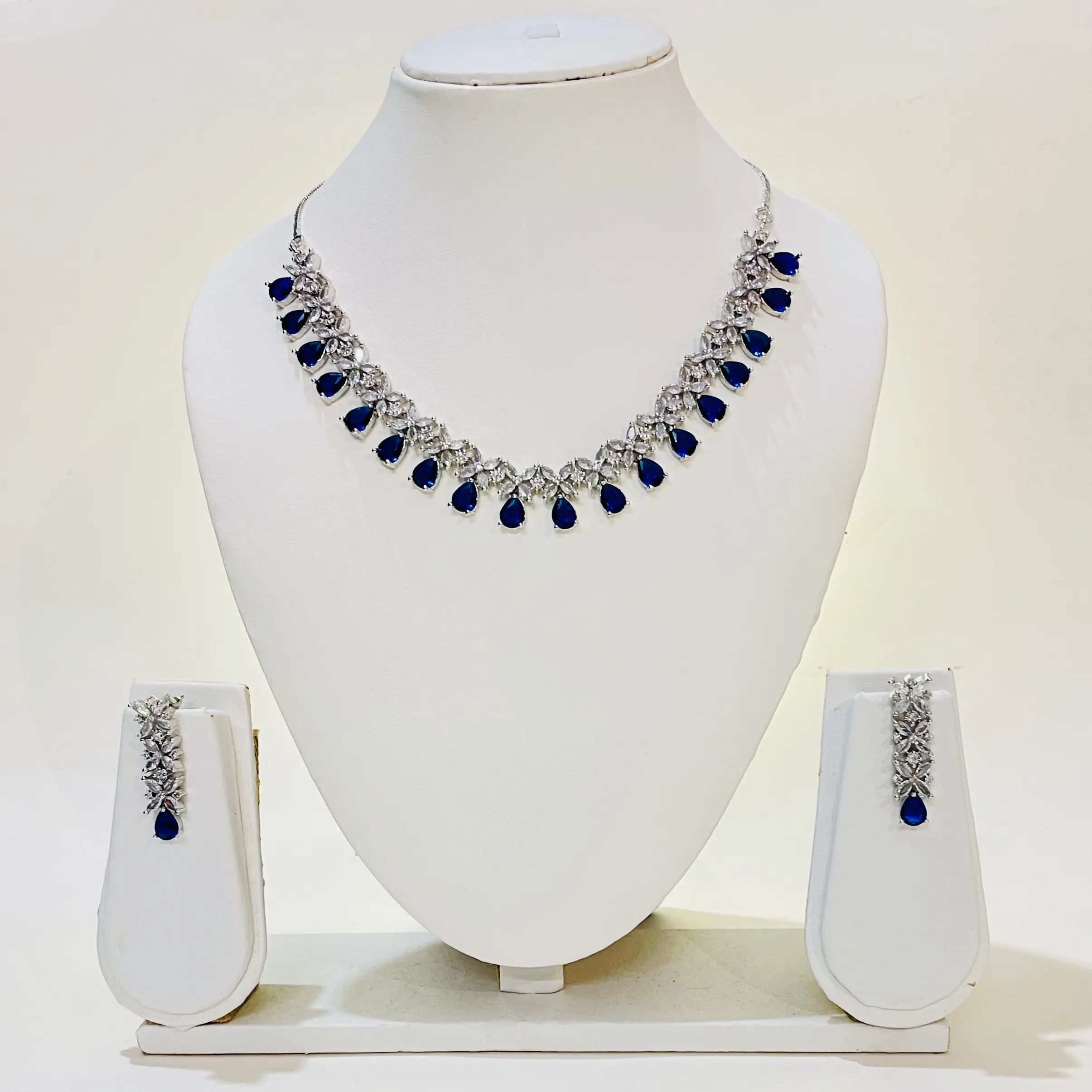 Blue American Diamond Necklace Set-Silver Polish