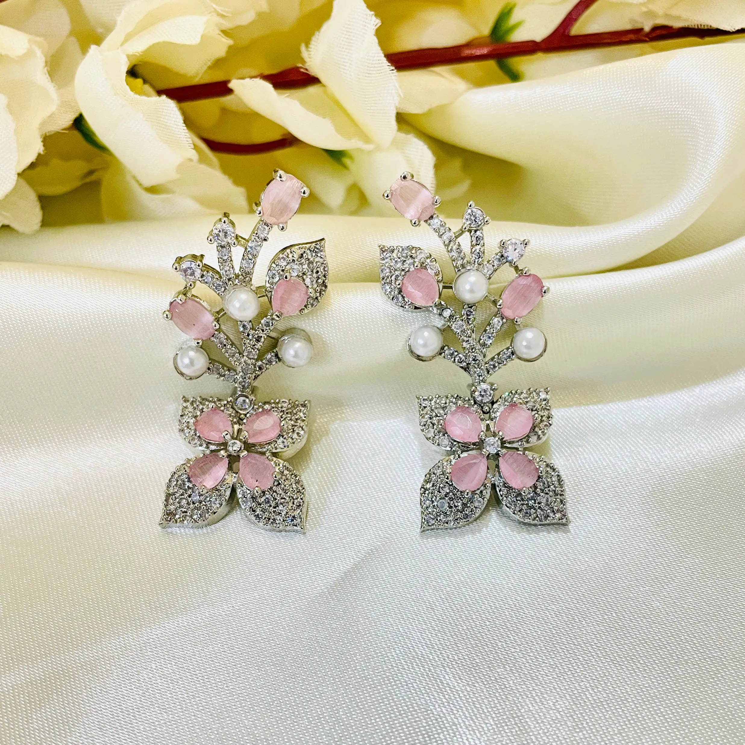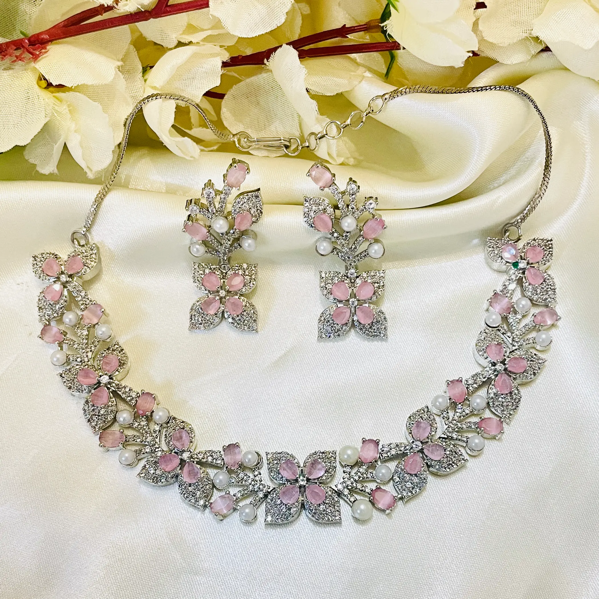 Pink Floral American Diamond Necklace Set-Silver Polish
