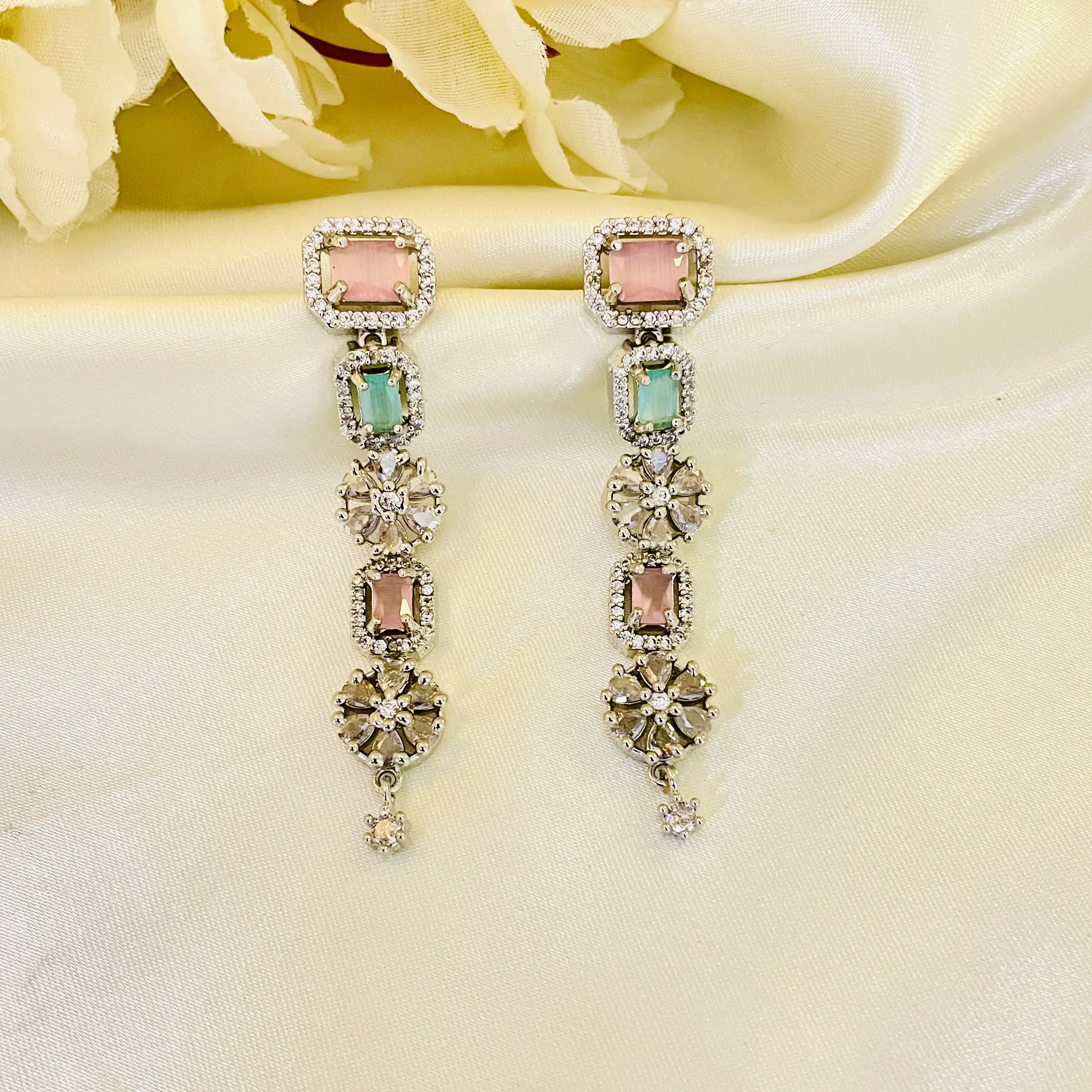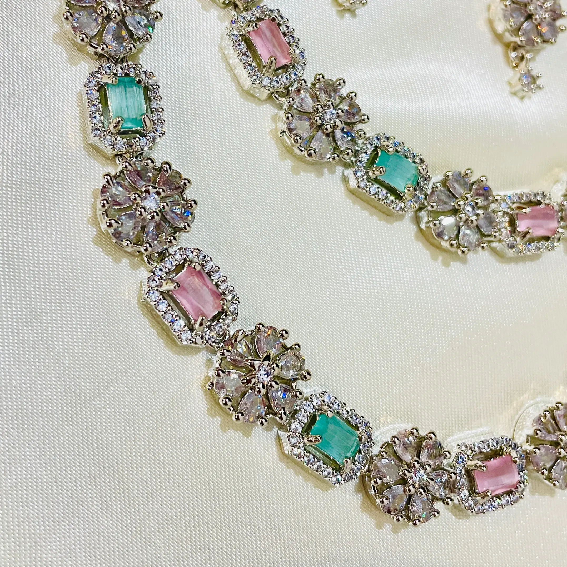 Pink+Mint American Diamond Necklace Set-Silver Polish