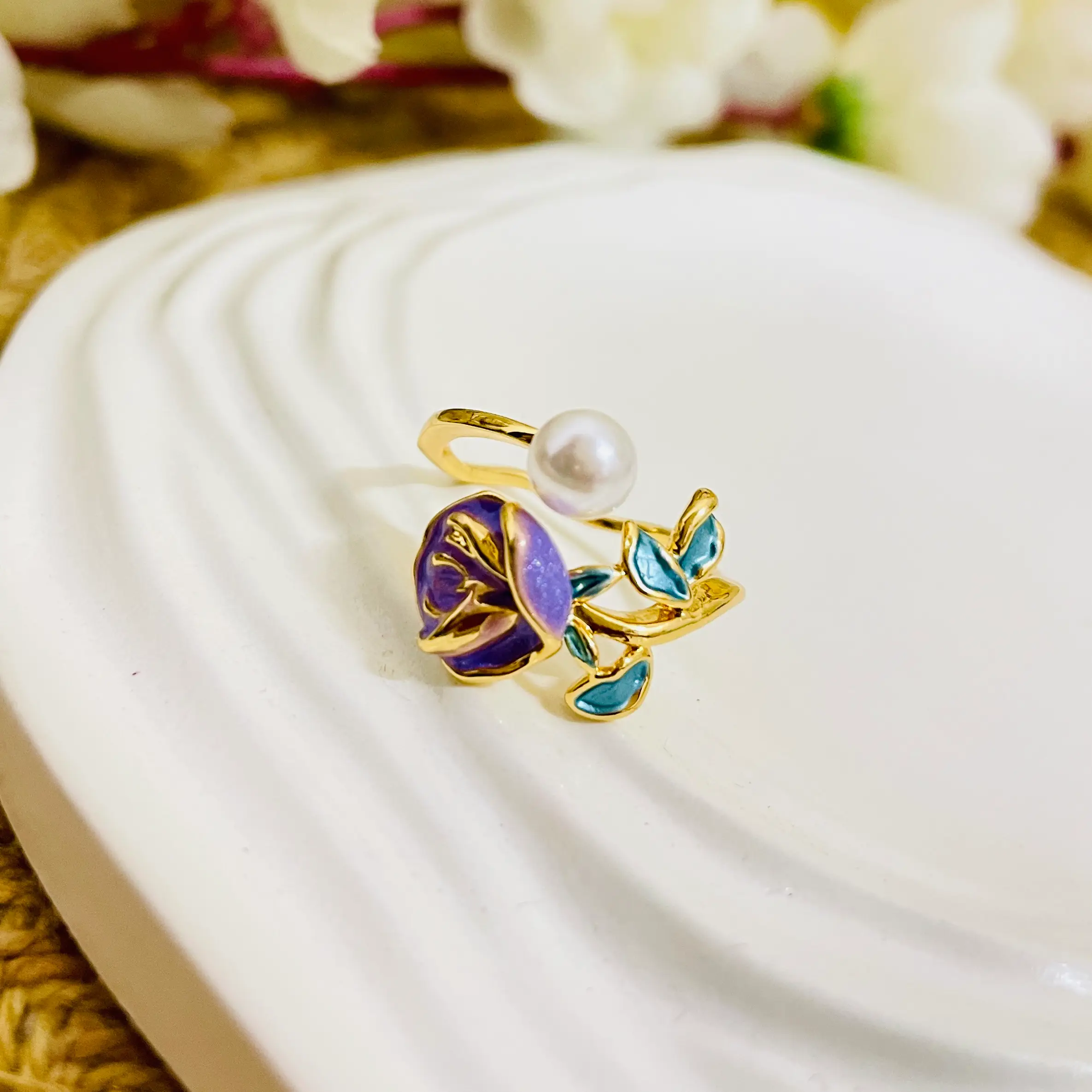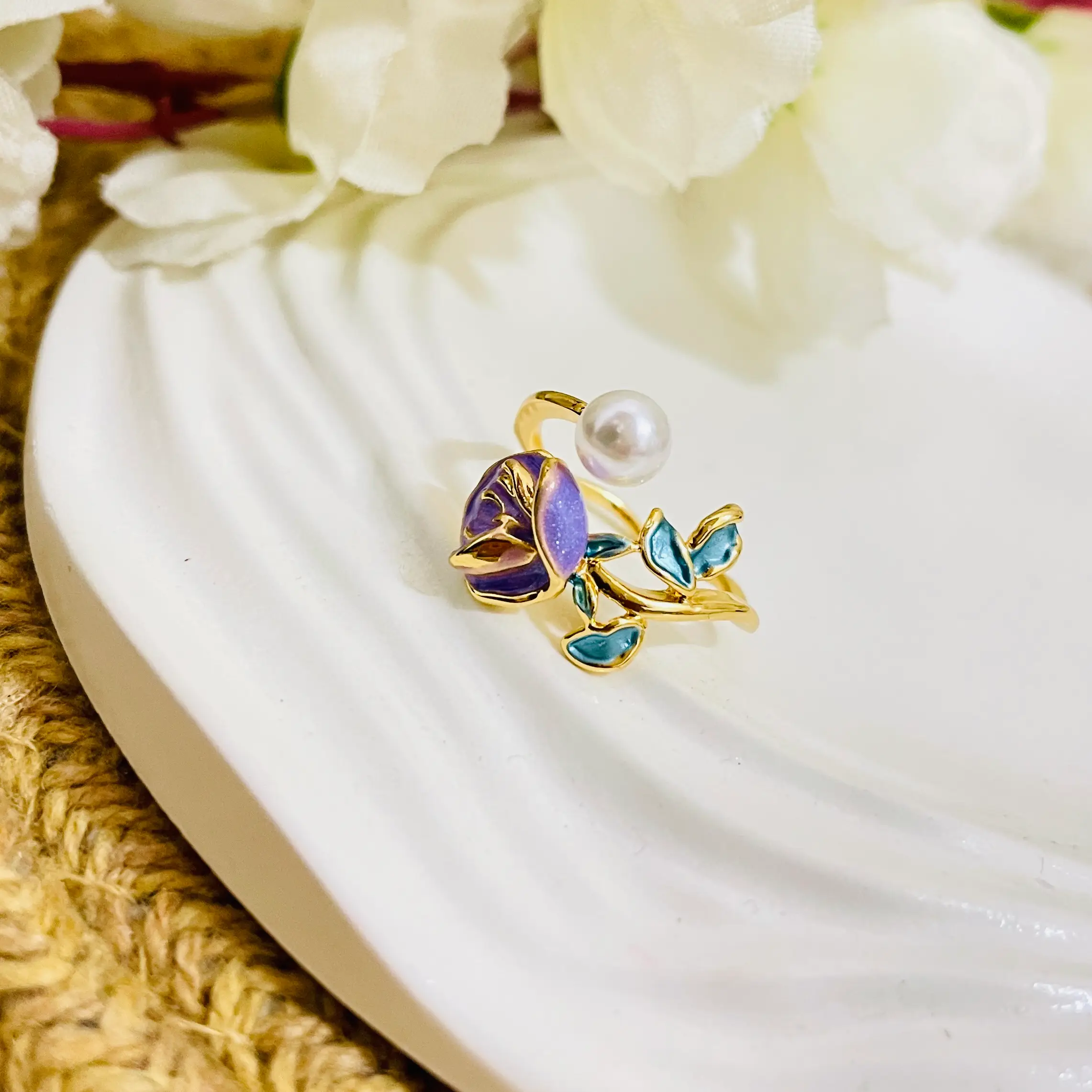 Embrace elegance with the Purple Rose with Pearl Ring, featuring a beautifully crafted purple rose design adorned with a lustrous pearl at its center. This exquisite ring blends romantic floral charm with timeless sophistication, making it a perfect accessory for special occasions or everyday grace. Crafted for durability and style, it adds a touch of color and refinement to any look.